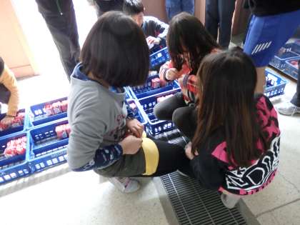 「自分たちのクラスも,もうちょっときれいに詰められるかも……」と,給食室でもう一度牛乳パックを詰め詰めしている子もいました。