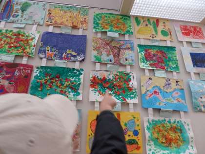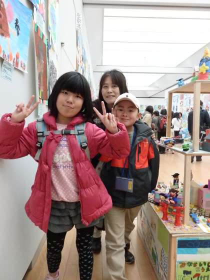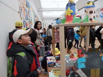 IさんとNさんの作品は入り口に近いところにありました。すぐに自分たちの作品を見つけて嬉しそうな2人です。近くの小学校の子たちと合同で作った作品も,会場で見るとまた迫力があります。