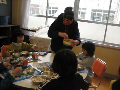 一年生やランチルームの二年生に、鬼に扮した給食調理員が食べてる様子を見ながら、声をかけながら「いりまめ」を手渡しました。