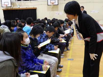 はじめに選挙に立候補した候補者の話を聞き,それぞれの政策を知ります。選挙の争点は「よりよい学校作り」それぞれの候補者が,学校のための政策を子どもたちに紹介していきます。立候補者を演じてくださっているのは学生さんたちです。