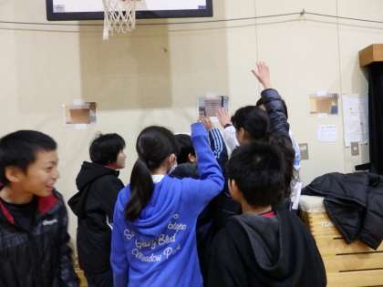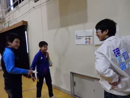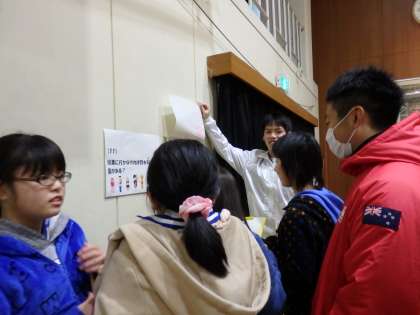 投票が終わり,開票作業中はクイズラリーが行われました。体育館中にはられている,選挙に関するクイズを解いてまわりました。各クイズのコーナーには,学生さんたちが立っていてくれていて,優しく解説をしてくれました。