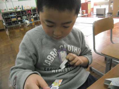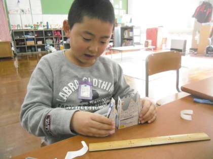お菓子の箱を使って動物や建物などを作ることができます。パッケージクラフトというそうです。明治製菓やハウス食品のホームページから作り方をダウンロードして作っています。お家の方々にはお菓子の箱を用意していただきありがとうございます。今日はヨーグレットの箱二つで富士山を作りました。
