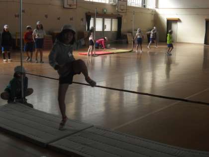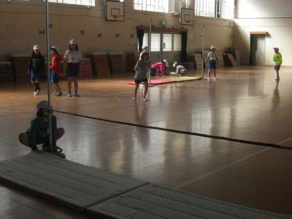 走り高跳びに挑戦しています。自分がどちらの足で踏み切るか決めて走り出す方向を決めました。