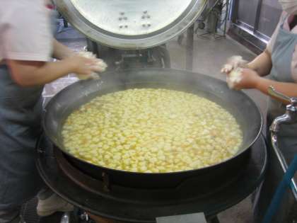 豆腐と白玉粉と水を捏ねてだんごを作り、だしの中に入れていきます。