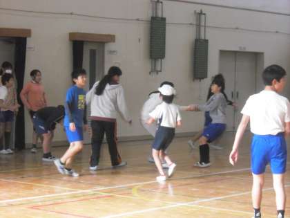 6−1の体育、しっぽとりに寄せてもらいました。4組2人は、タグのお兄さんチームやタグ&大文字チームに入れてもらいました。お兄さん達は二人を守ってくれるのですが、人数は相手チームの方が多いのですぐとられていました。