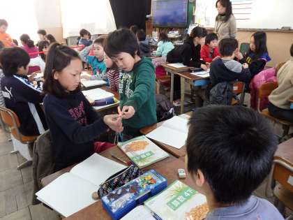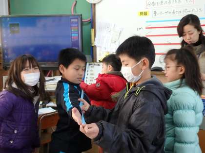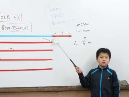 テープを折ってみたり,重ねてみたりいろいろな方法を試し,赤いテープの1/4が青いテープのはしたにぴったりと合うことに気付くことができました。気付いたことを説明するのも,とても上手になっています。