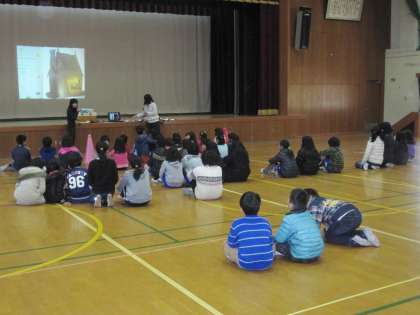 今日の昼休みに体育館で英語の本の読み聞かせがありました。読書週間には毎回いろいろな企画をしていますが,英語の読み聞かせは今回初めての企画です。今回のお話は『ブレーメンの音楽隊』でした。動物の名前や鳴き声の英語クイズもあり,はじめて英語の読み聞かせを聞く子でも楽しめたようでした。