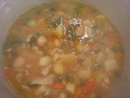 「鶏肉と野菜の煮つけ」は味付けしただしの中に鶏肉・人参・玉ねぎ・じゃがいもをコトコトと煮込みました。最後に茹でた三度豆を入れて仕上げました。彩りも良く美味しかったです。