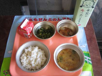 麦ごはん・牛乳・平天の煮つけ・だいこん葉のごま炒め・みそ汁