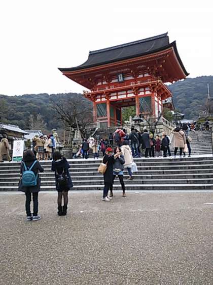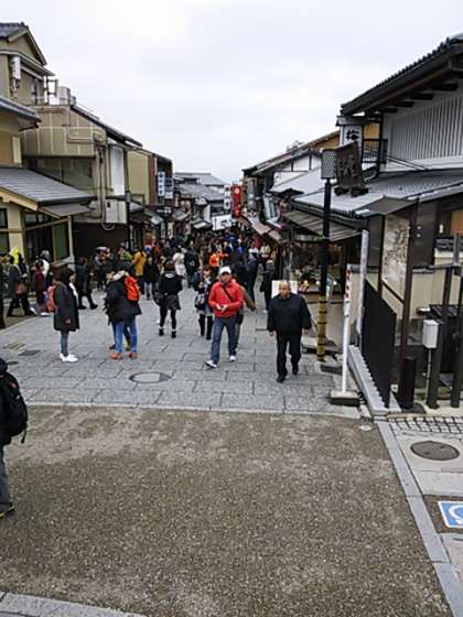 午後の清水坂。ますますたくさんの観光の方です。聞こえてくる言葉は日本語と外国語がハーフハーフ。こんな中を、グループがはぐれず、きてくれますように。