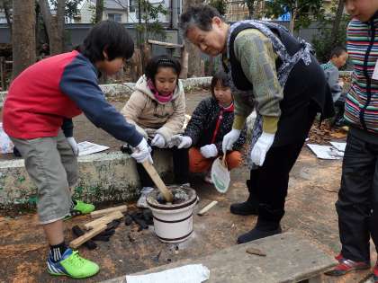 まずは火おこしから始めます。新聞紙や木に火をつけて,木炭に火をうつしていきます。