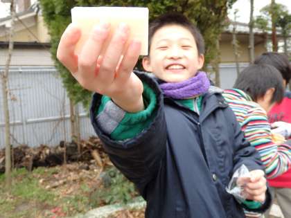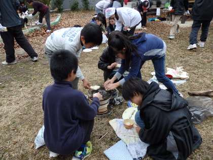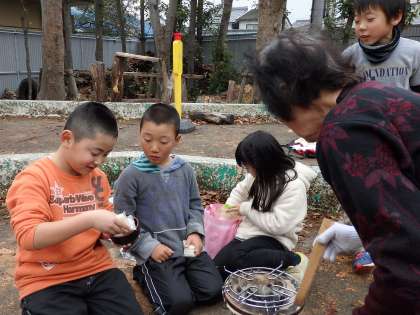 火がうつったら,いよいよ楽しみのお餅です。火力が強い場合は,網と七輪の間に木をはさんで,焦げないようにすることも教えてもらいました。