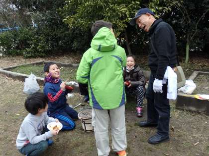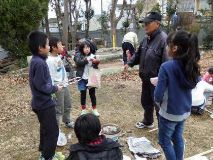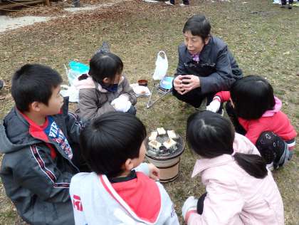 お餅を焼いている間は七輪を囲みながら,来てくださった地域の方々と色々なお話をしていました。子どもの頃はどんな遊びが好きだったという話や,学校まで歩いて行くのに時間がかかったという話を聞いて,親近感がわいたようです。はじめは緊張していた子どもたちも,楽しそうに盛り上がっていました。