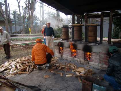 みどりの広場のかまどでもち米を蒸してくださっています。