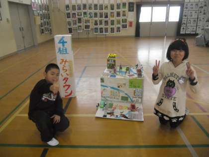 今日から作品展です。4組は立体の共同作品で「未来タウン」を、平面作品は版画を出展しました。