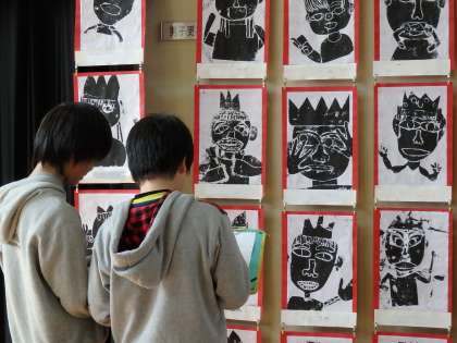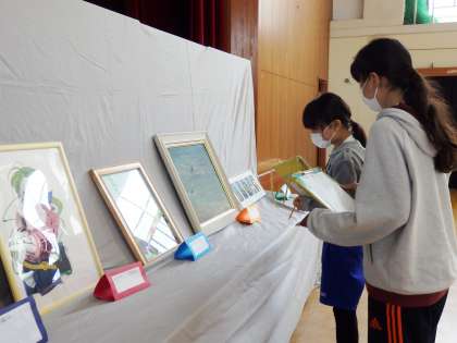 地域の方の作品や交流学校の作品もたくさん展示されています。「売り物みたいにすごい!」と感動していたり,交流学校の友だちのことを思い出したりしながら鑑賞をしていました。