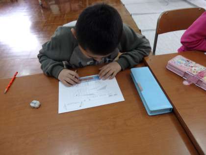今日の算数の時間は,数直線のめもりの勉強をしました。2人とも器用に定規を使って数直線の線をかいていきます。余った時間には,図形をかく練習もしました。見本の魚の図と一緒になるように,ななめに横に丁寧に線を引きました。