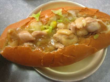 「てりやきチキンサンドの具」は新献立です。子どもたちがパンに切り目を入れて、具を自分ではさんで食べる、セルフサンドの献立です。甘辛く味つけした「てりやきチキン」と「キャベツとコーンのソテー」を一緒にはさんで頂きました。