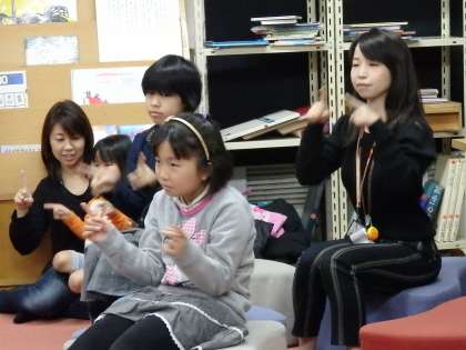 次は手話で話そうコーナーでした。ありすのいえの方が手話のやり方を教えてくださいました。みんなで教科を表す言葉に挑戦です!