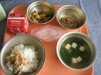 ごはん・牛乳・ちらしずしの具・ツナそぼろ・すまし汁・三食ゼリー