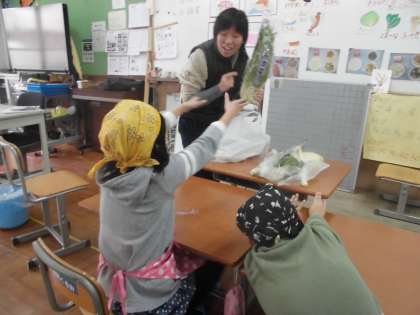 はじめは,今までの勉強の復習です。お味噌汁に合いそうな食材を赤・黄・緑の栄養に分けていきます。IさんもNさんも今までの勉強をとてもよく覚えていて,栄養の先生もとても感心されていました。
