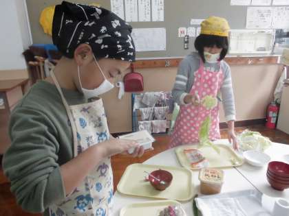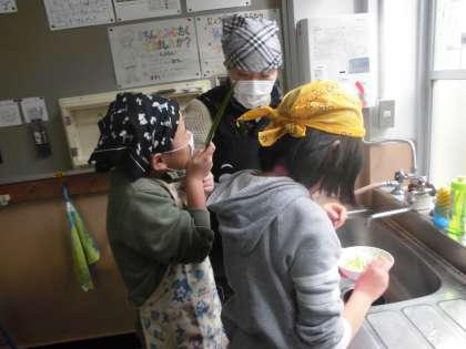 調理もとても手際よくできていました。大きな食材をキッチン用ハサミで食べやすいサイズに切っていきました。2人とも美味しいお味噌汁ができたかな?