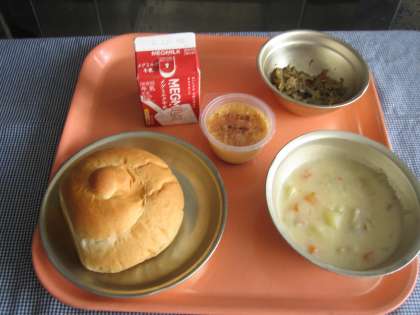 バターうずまきパン・牛乳・じゃがいものクリームシチュー・ごぼうのソテー・プリン