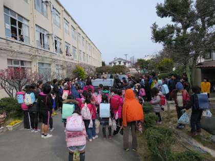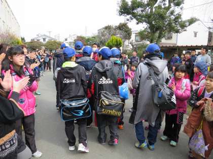 先ほど,タグラグビー部が全国大会に参加するため,たくさんの子どもたちや教職員の拍手や応援の声の中,学校を出発しました。