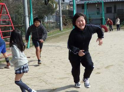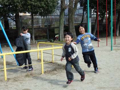 今回,運動場グループで人気だったのは警泥でした。遊具の上り棒を檻に見立てて使っています。運動場中を走り回ってとても楽しそうでした。