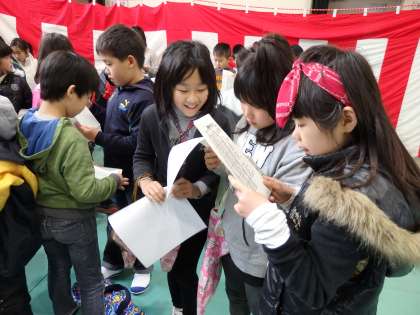 さて,お楽しみの担任発表は学校の教職員の紹介と一緒に行われました。自分たちの学年のクラスの先生が呼ばれると「わぁっ!」と歓声が上がります。予想通りだった学年も,意外でビックリ!な学年もあったようです。その後,すぐに学年に分かれ,クラス発表もありました。1〜5年生は2クラス,6年生は3クラスです。どの子と一緒のクラスか,ドキドキしながら確認をしていました。