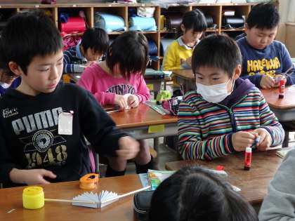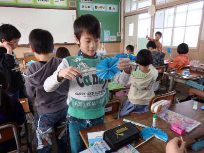 今日は角度の大きさを調べるための道具を作りました。くるっと回すと花のように広がる装置にみんな大喜びでした。明日もこれを使って角度の学習をしていきたいと思います。