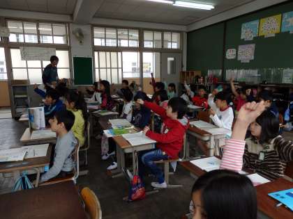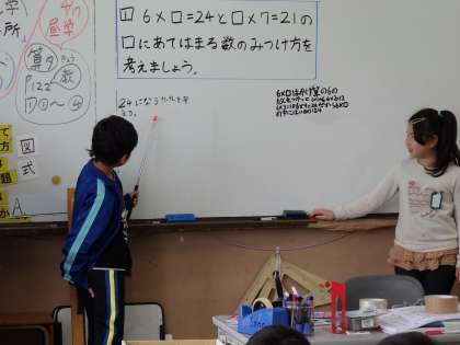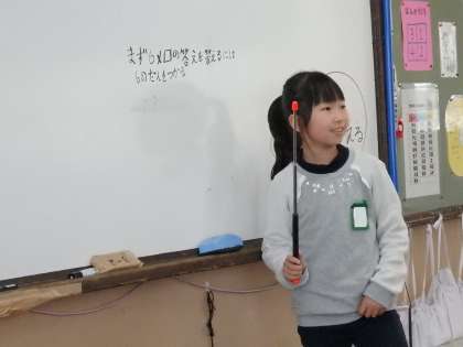 3年生は今日,算数で『かけ算をつかって』をしました。かけ算の表や九九を使って,6×■=24のような問題を解く学習です。写真は,なぜ■の中が分かったのかを考えて,発表しているところです。ハンドサインもしっかりできていて,とても活発な授業になりました。