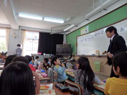 1年生はひらがなの学習をしました。はじめは先生と一緒に声を出す練習をしました。