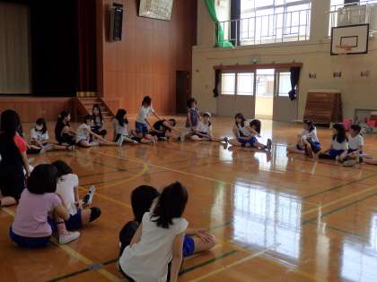部長さん・副部長さんは決まってすぐに大仕事です。さっそく,みんなに柔軟体操の方法や,準備体操を教えてくれました。