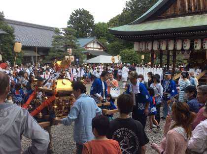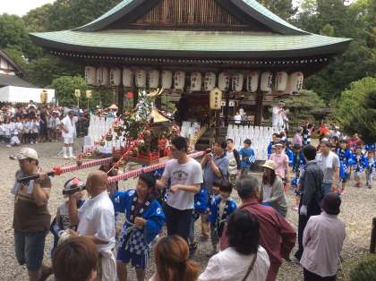 5月3日,梅宮大社の神幸祭です。各町内の子ども神輿が次々に境内から出発しました。子どもたちは法被やはちまき姿で凛々しい表情でした。