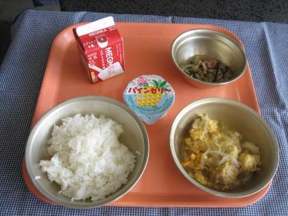 ごはん・牛乳・厚揚げのチャンプル・クーブイリチー・パインゼリー