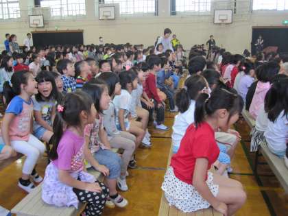 いよいよ公演が始まりました!とてもカッコいいお兄さんお姉さんの登場に,みんな大きな拍手をします。「和太鼓の演奏を聴いたことある人?」という質問にも,元気いっぱいに答えていました。