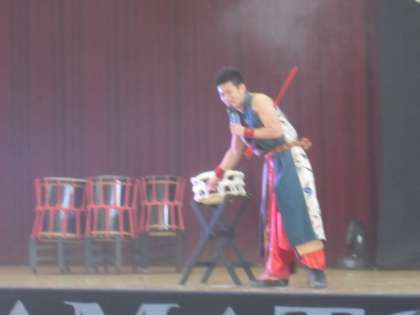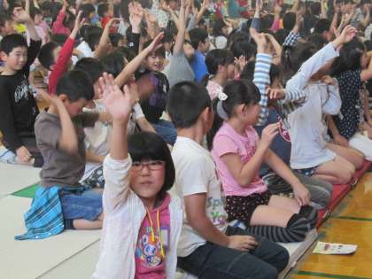 演奏の合間には,太鼓の名前や特徴を教えていただきました。ひもで縛ってあるのが『締太鼓』,胴体が桶でできているのが『桶胴太鼓』,とても大きな通称『大平』と呼ばれる太鼓は,樹齢400年もの木の幹をそのままくり抜いて太鼓にしていることなど,たくさんのことを教えてくださいました。