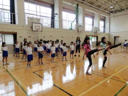 4年生以上は,去年からの積み重ねで,ピシッと背筋を伸ばして足上げができます。今日初めて練習した3年生は,なかなか背筋を伸ばしたまま……は難しいようすでした。これから,練習を頑張って,どんどん上手になりましょう!