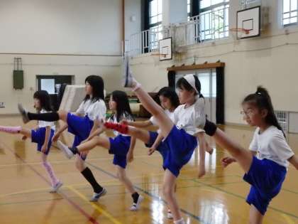 金曜日のチアリーディング部の活動のようすです。金曜日は,前半に基礎練習をしました。足上げやスッテプなど,6年生が3年生に見本を見せます。