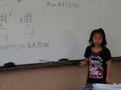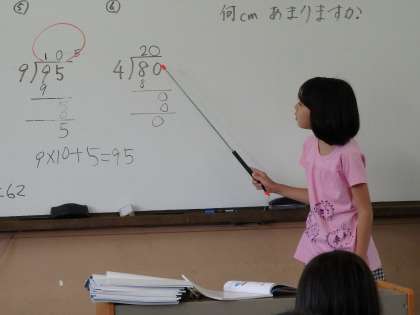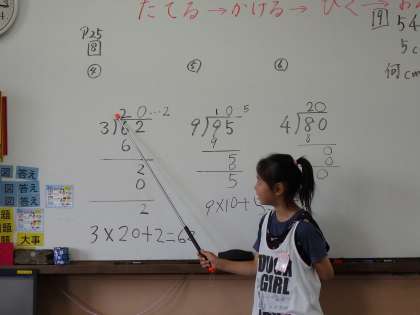 4年生は今,わり算の筆算をしています。あまりのあるわり算や,確かめの方法なども学習しています。「たてる」「かける」「ひく」「おろす」の手順をしっかり覚えられるよう,繰り返し学習をしています。