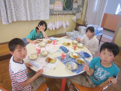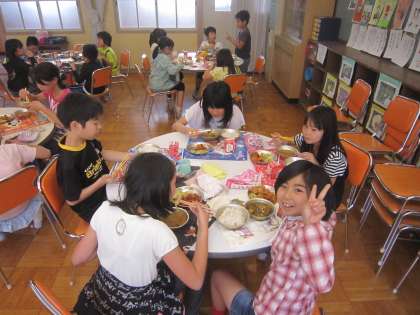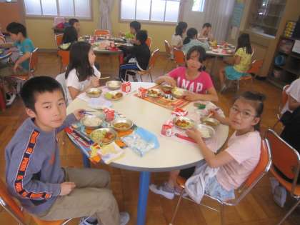 写真は月曜日の給食のようすです。献立はチキンカツでした。給食調理員さんが1つ1つ衣をつけて揚げてくれるチキンカツは,子どもたちにも大人気のメニューです!
