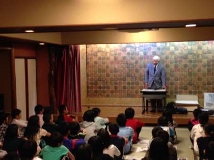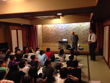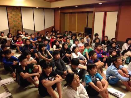 小出先生の講演が始まりました。戦争の時代,動物園に動物がいなくなってさみしい思いをしていた各地の子どもたち。終戦後,東山動物園で守り抜かれたゾウをみるために特別仕立ての「ぞうれっしゃ」が,全国各地から東山動物園にやってきました。事前学習に取り組んできた梅津北小の6年生は,小出先生のお話に聞き入っています。
