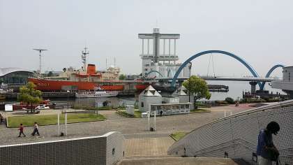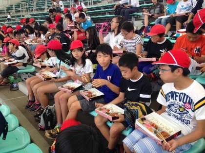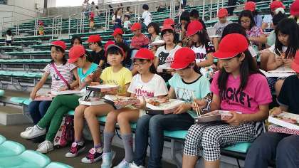 昼前に名古屋港水族館につきました。イルカショーのところでお弁当を食べています。