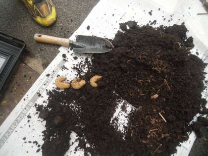 取り出した土は幼虫の糞だらけ。今回も畑の土に混ぜました。