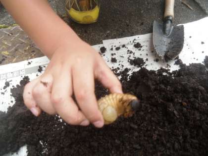 そして今日、土の入れ替えをしました。「3年前まで4組の担任だったN先生は確かこの季節、土の入れ替えをしたはった」という記憶がよみがえってきたのです。ケージの下10センチくらいはサナギの部屋が作りやすいように押し固めることも忘れませんでした。見てください。この立派な幼虫。Kさん、ありがとう!!