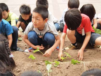 地域の方の話をよく聞いてから植えようとする,子どもたちの真剣な姿勢を見ることができました。