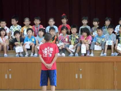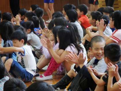 他の学年は拍手で1年生をお迎えしました。全員が席に着いたら,迎える会の始まりです!代表委員会の児童が始まりのあいさつをしてくれました。