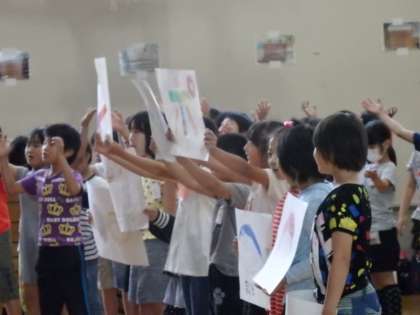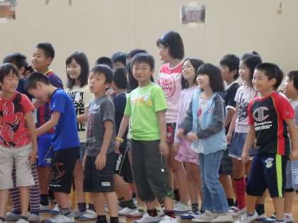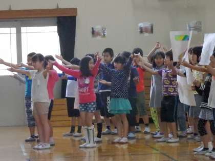 4年生は明るいリズムの『プパポ』という曲に合わせて,元気いっぱいに歌とダンスを踊ってくれました。歌の後には,曲に関するクイズを1年生に出していました。