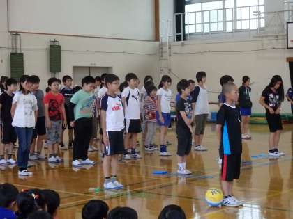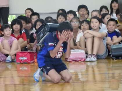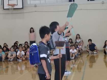 6年生も歌と寸劇を披露してくれました。とび箱や縄跳び,ポンポンにボールなど様々な小道具を用意して,寸劇に挑みました。高いとび箱を跳んだり,体を張ったパフォーマンスで,1年生たちだけではなく他の学年の子たちからも歓声が上がりました。